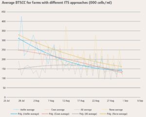 So, after several evolutions, the place of teat sealants can be summed up with the statement that, “All cows and heifers benefit from teat sealants, but some cows may also need antibiotics”. Following such a policy is also paying dividends. The below graph shows the average BTSCC of farms divided by which groups of cows receive teat sealants. It is apparent that, as more teat sealant is used, the initial BTSCC that the herd begins with becomes increasingly lower. Those herds not using it at all have a BTSCC that follows a traditional trajectory, of starting high in spring then slowly coming more under control as the season progresses. This is contrasted by the herds that use teat sealants in both heifers and cows which actually calve in with very low BTSCCs, and which remain more or less stable throughout the early part of spring. Herds using teat sealants in either heifers or cows, but not both, experience a pattern somewhere in between these two outcomes. We see this pattern more and more in practice when we sit down with clients at our milk quality reviews. Years ago, it was common for farms, where mastitis was under control, to still treat 2-4% of their cows each month in August and September, which they could often rein in to around 1-2% by November. These days, we often look at herds that have negligible mastitis in August and September, with 1-2% developing through October into November. The main driver appears to be teat sealants suppressing that early spring mastitis.